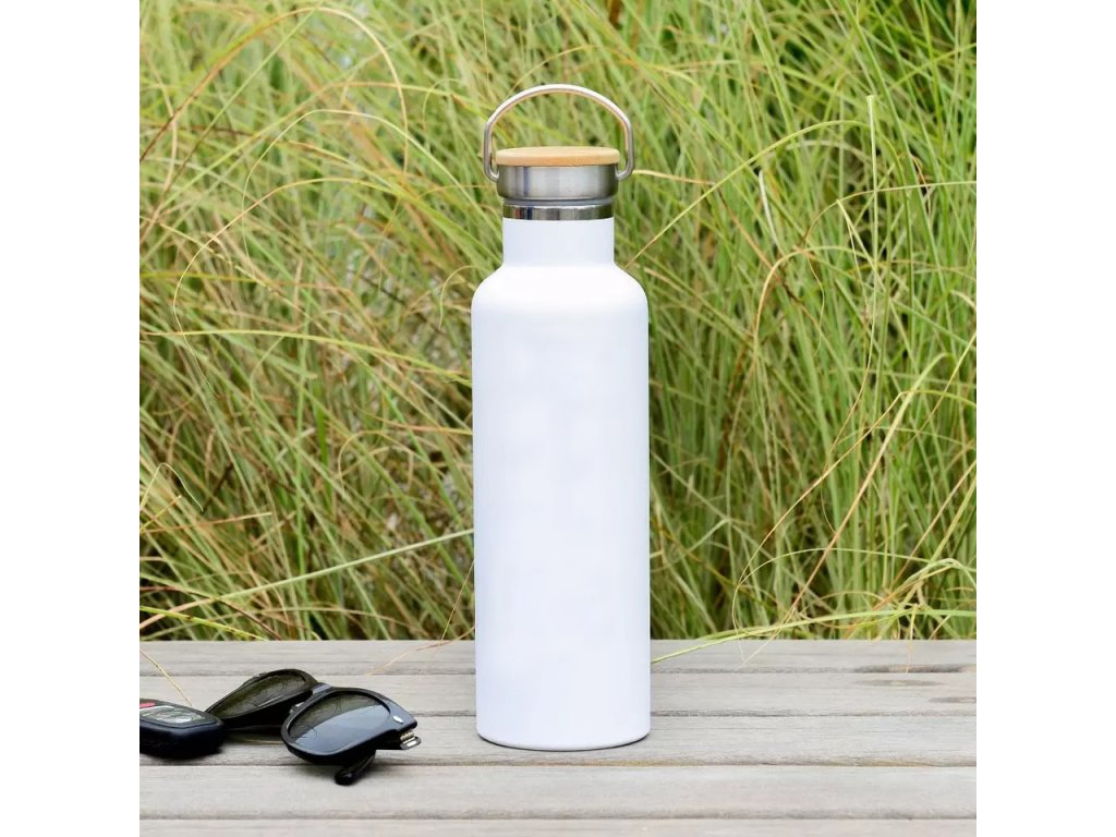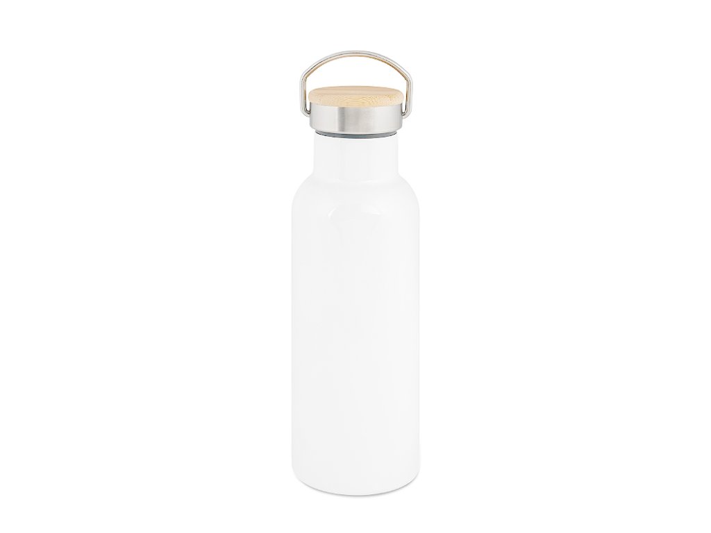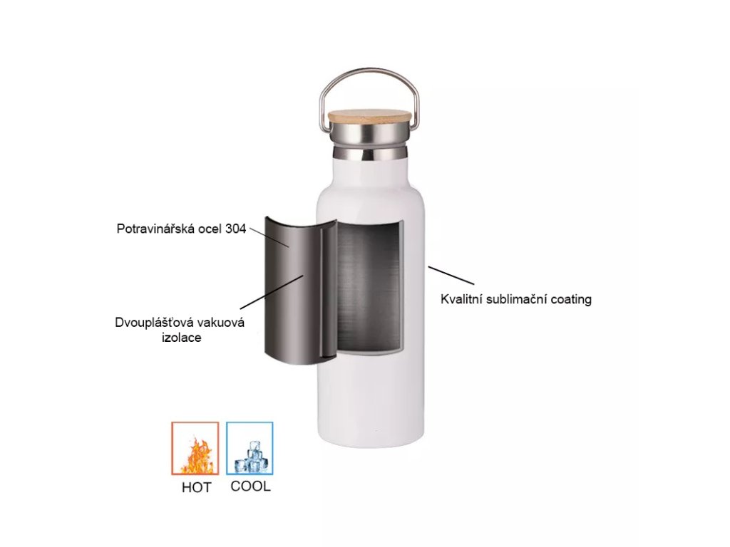 Elegantní cestovní bílá termoska pro potisk sublimací se šroubovacím bambusovým víčkem a praktickým sklopným nerezovým poutkem. Samotné víčko má několik předností - silikonové těsnění, šroubovací uzávěr z nerezové oceli a samotný bambusovvý vršek s antibakteriálním povrchem. Do bambusu lze gravírovat nebo laserovat. Lze potisknout pomocí laserové tiskárny a fólie FOREVER Multitrans PLUS.Specifikace: