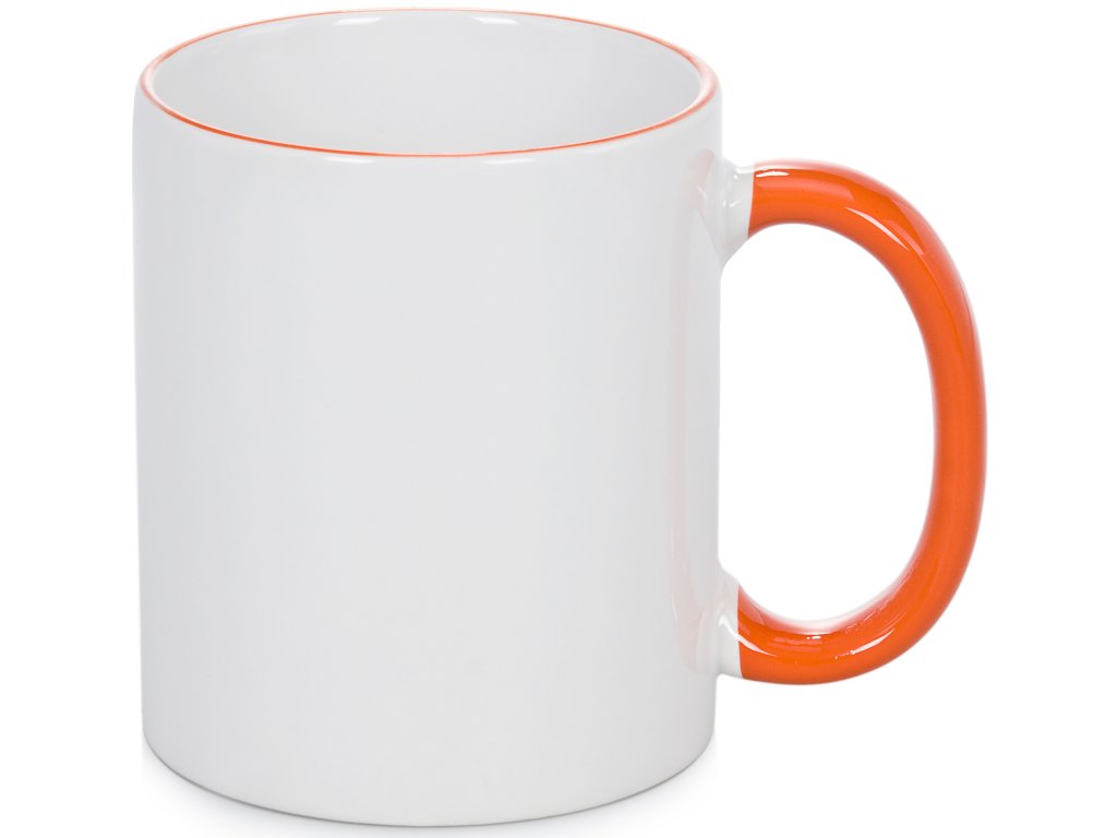 Keramický bílý hrnek s oranžovým lemem a uchem.Určený pro potisk sumblimací. Parametry pro potisk: Aplikační teplota: 180oC Čas: 20 vteřin ( výtisky z tiskáren Sawgrass a Ricoh )
