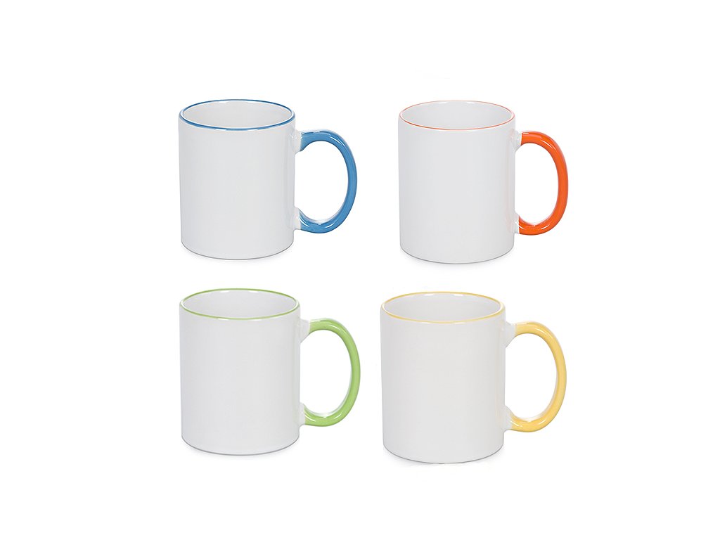 Keramický bílý hrnek s barevným lemem a uchem.Určený pro potisk sumblimací. Průměr: 82 mm Výška: 95 mm Parametry pro potisk: Aplikační teplota: 180oC Čas: 20 vteřin ( výtisky z tiskáren Sawgrass a Ricoh )