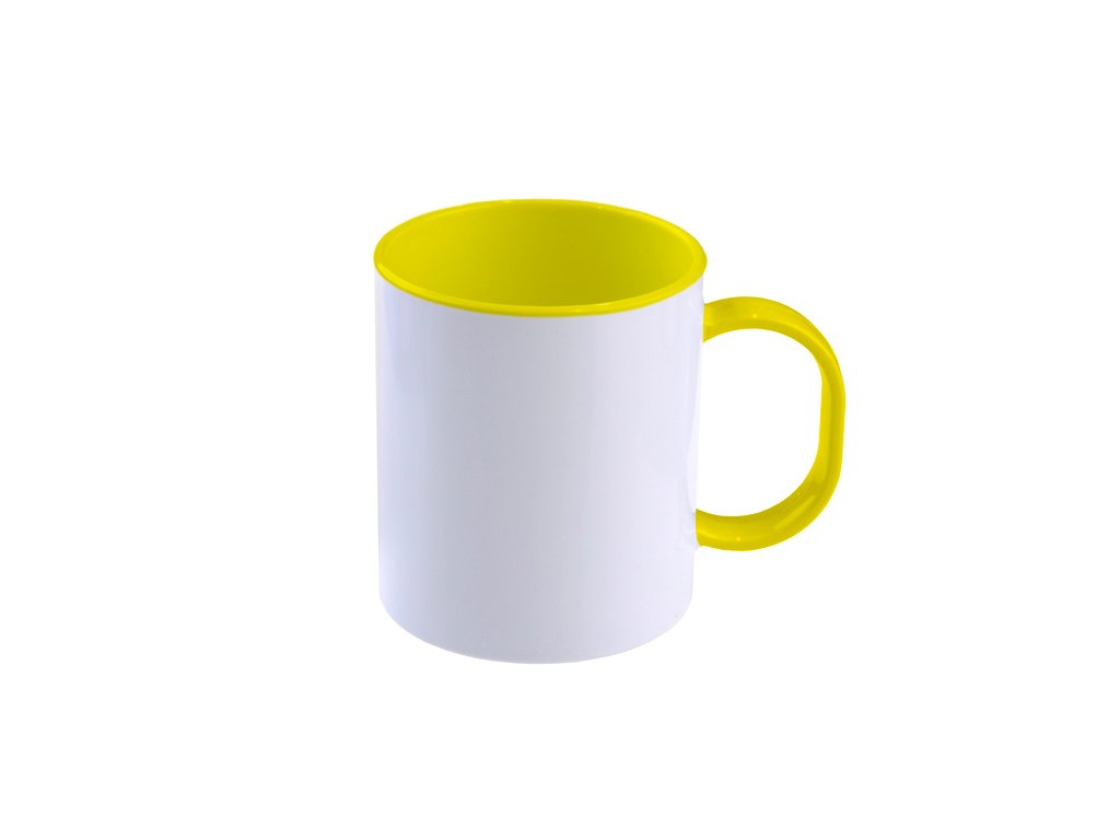 Hrnek bílý s barevným vnitřkem a uchem v barvě žluté - vyrobený ze sublimačního polymeru vypadá docela podobně jako běžný keramický hrnek na kávu, přesto je zcela bez sublimačního povlaku. Tento hrnek je vyroben z polymerového materiálu šetrného k barvivům sublimační barvy s vysoce lesklým povrchem a ultra bílé tělo hrnečku. Na tento hrnek můžete použít jakýkoli druh obrázků, log nebo vlastních návrhů kreseb pomocí běžného sublimačního hrnku. Polymerové hrnky jsou vyrobeny ze sublimovatelného polymerního materiálu, který nevyžaduje další povrstvení pro sublimaci - obrázky lze potisknout sublimací přímo na povrch hrnku. Výsledkem je delší trvanlivost tištěných obrázků. Ve srovnání s keramickým materiálem jsou polymerové hrnky prakticky nerozbitné a mají matný nebo lesklý povrch. Všechny plastové hrnky jsou schváleny FDA a jsou v souladu s RoHS.Objem 300 ml