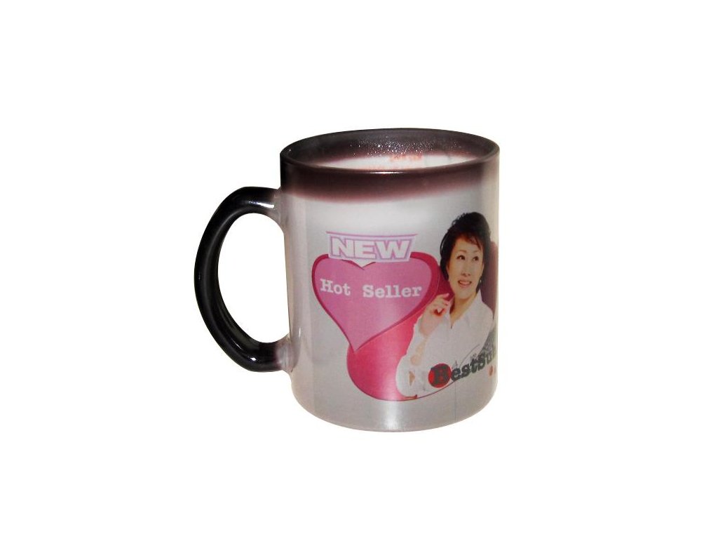 Černý sklěněný hrnek s termoaktivní vrstvou, která se po nalití horké tekutiny stane čirou.Objem: 11 Oz / 325 ml