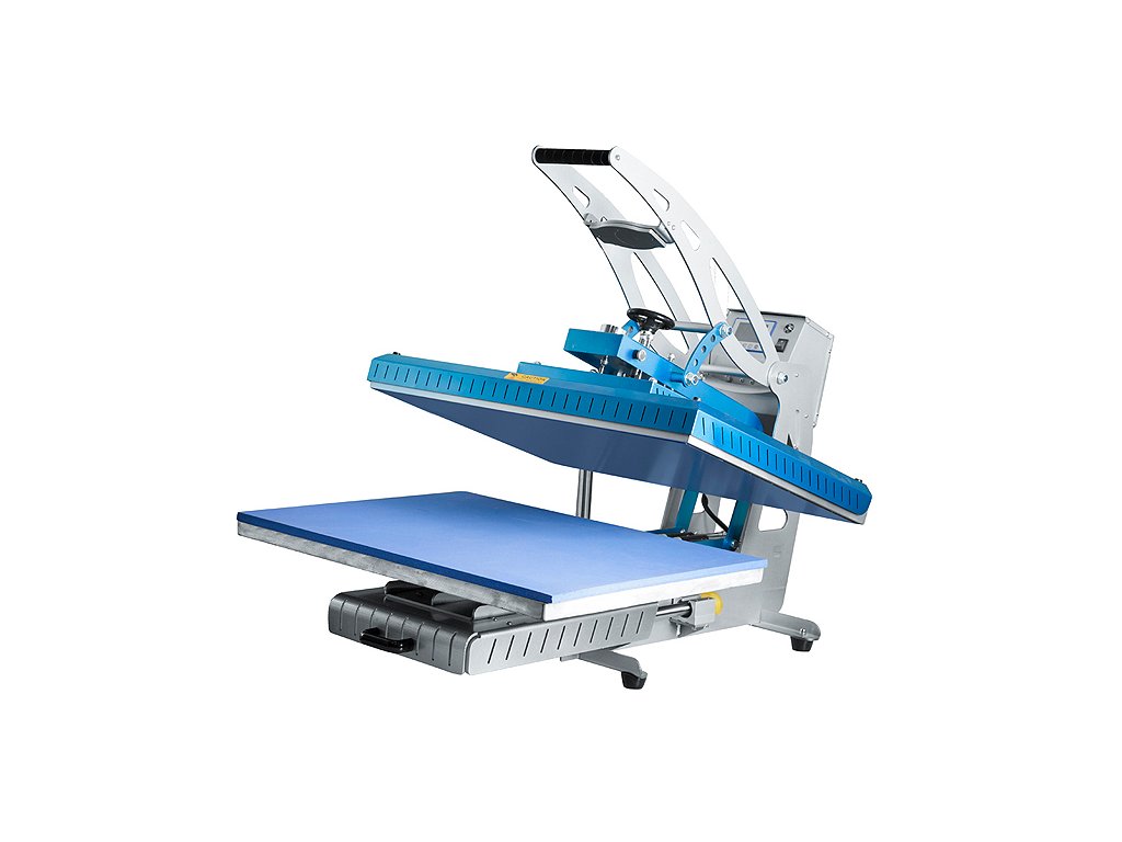 Robustní teplný lis s automatický otevíráním. Výsuvný pracovní stůl - jenodušší připrava pro potisk a minimální riziko popálení.Rozměr pracovní desky: 100 x 50 cm