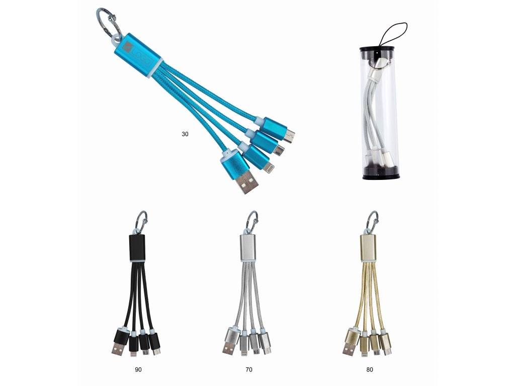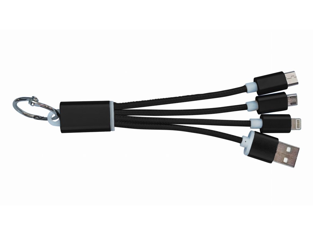 Přívěšek s redukcemi USB / Micro USB / iPhone / USB – C, s kabely v nylonovém opletu a koncovkami v hliníkovém pouzdře