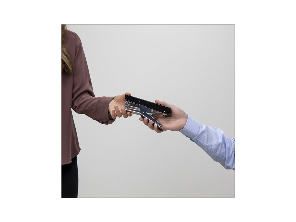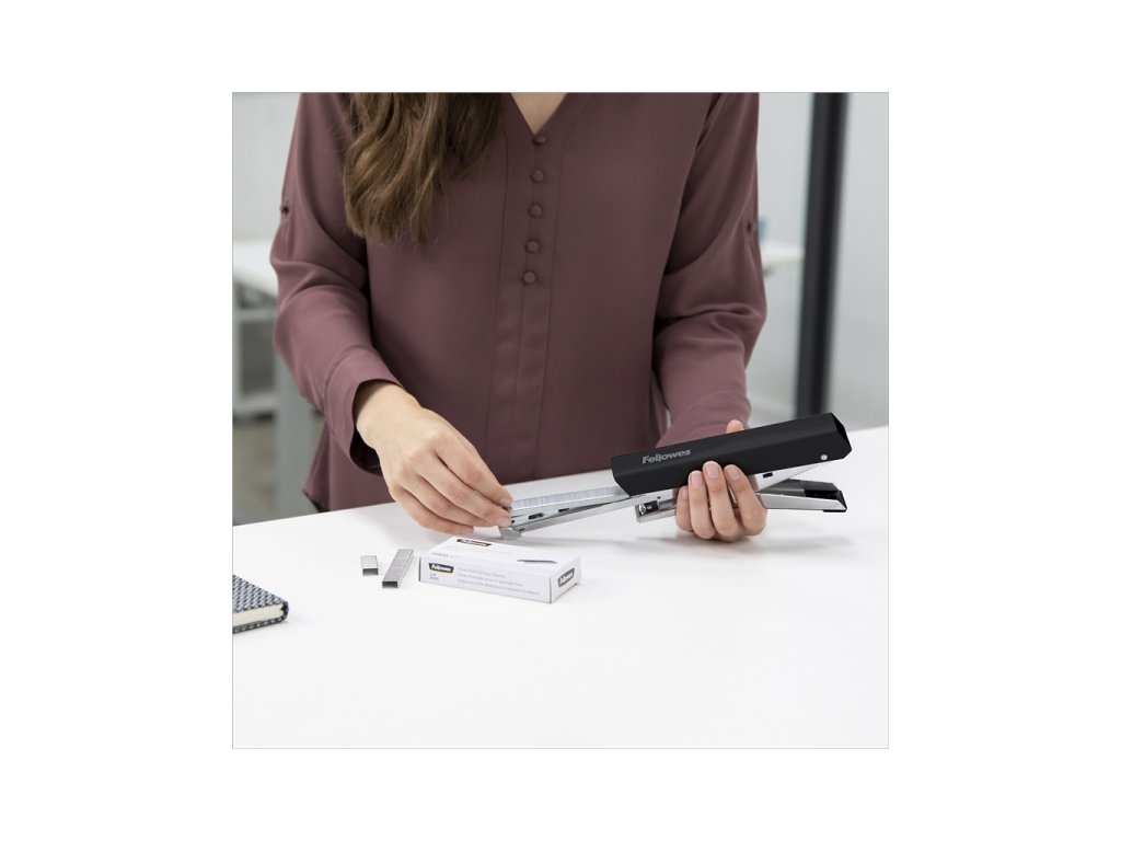 Sešívací kleště Fellowes LX 850 černé s antimikrobiálním ochranou Microban, která zabraňuje růstu zápachu a bakterií na povrchu. Odolné, vysoce kvalitní, nůžkové kleště s celokovovou rukojeti zajišťují spolehlivé sešívání. Kapacita sešití až 40 listů 80g papíru.Funkce EasyPress usnadňuje sešívání papíru, zcela bez námahy.Ergonomické.Odolná konstrukce umožňuje sešívání bez zaseknutíSnadné doplňování drátků díky přednímu plnění.Pro použití se sponami 24/8 a 26/8.Kompatibilní s drátky 24/6 a 26/6 (max. sešívací kapacita je u těchto spon 25 listů).Může se ukládat svisle nebo zavěsit na zeď.Doplňkové parametry