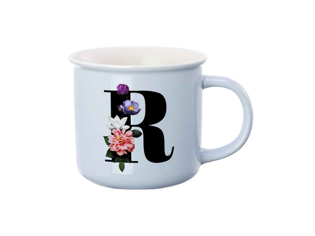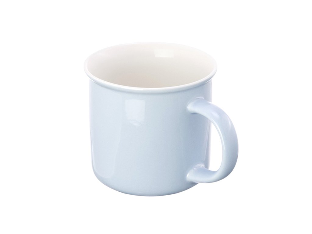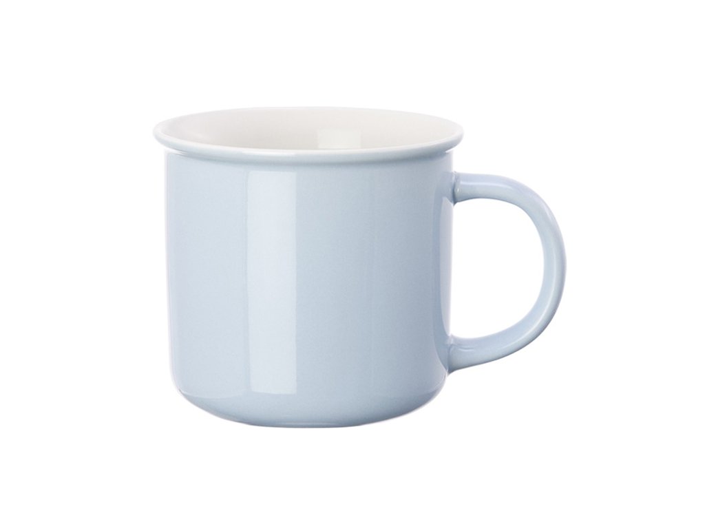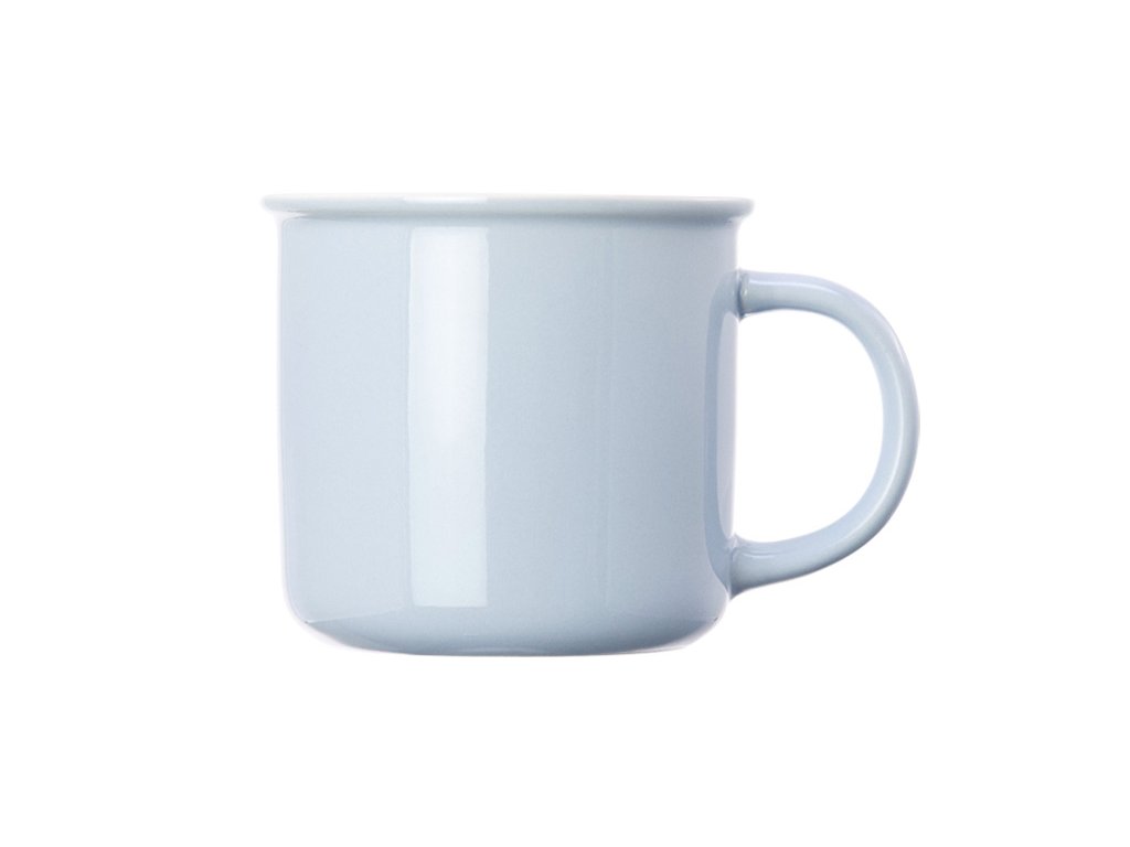Světle modrý porcelánový hrnek s bílým lemem imitující smalt